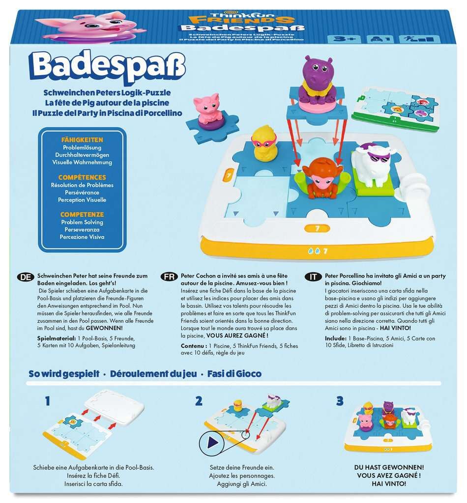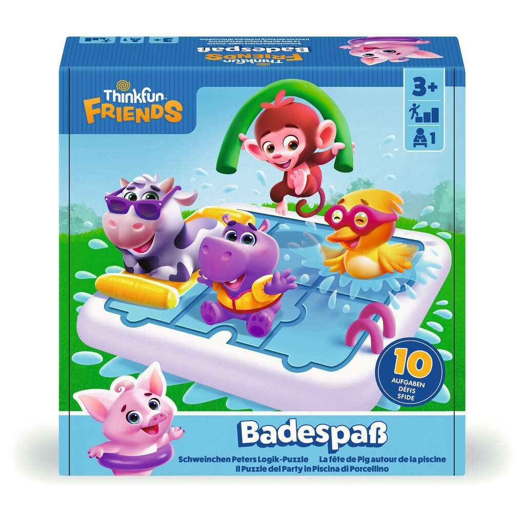 ThinkFun -76654 - Badespaß - Das platschnasse Knobelspiel mit Schweinchen Peter und seinen Thinkfun Freunden! Logikspi Schweinchen Peter braucht dringend Hilfe, damit all seine Freunde gemeinsam in den Pool passen. Zum Glück hat Peter eine besondere Superkraft...