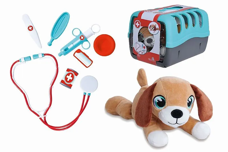 Mit dem modernen Tierarztkoffer sind eure Tiere immer bestens versorgt. Die blau-graue Transportbox mit Griff zum Tragen bietet dir alle nötigen Utensilien für eine Untersuchung deiner Lieblinge. Neben einem süßen braunen 24cm großen Plüschhund als ersten Pati...