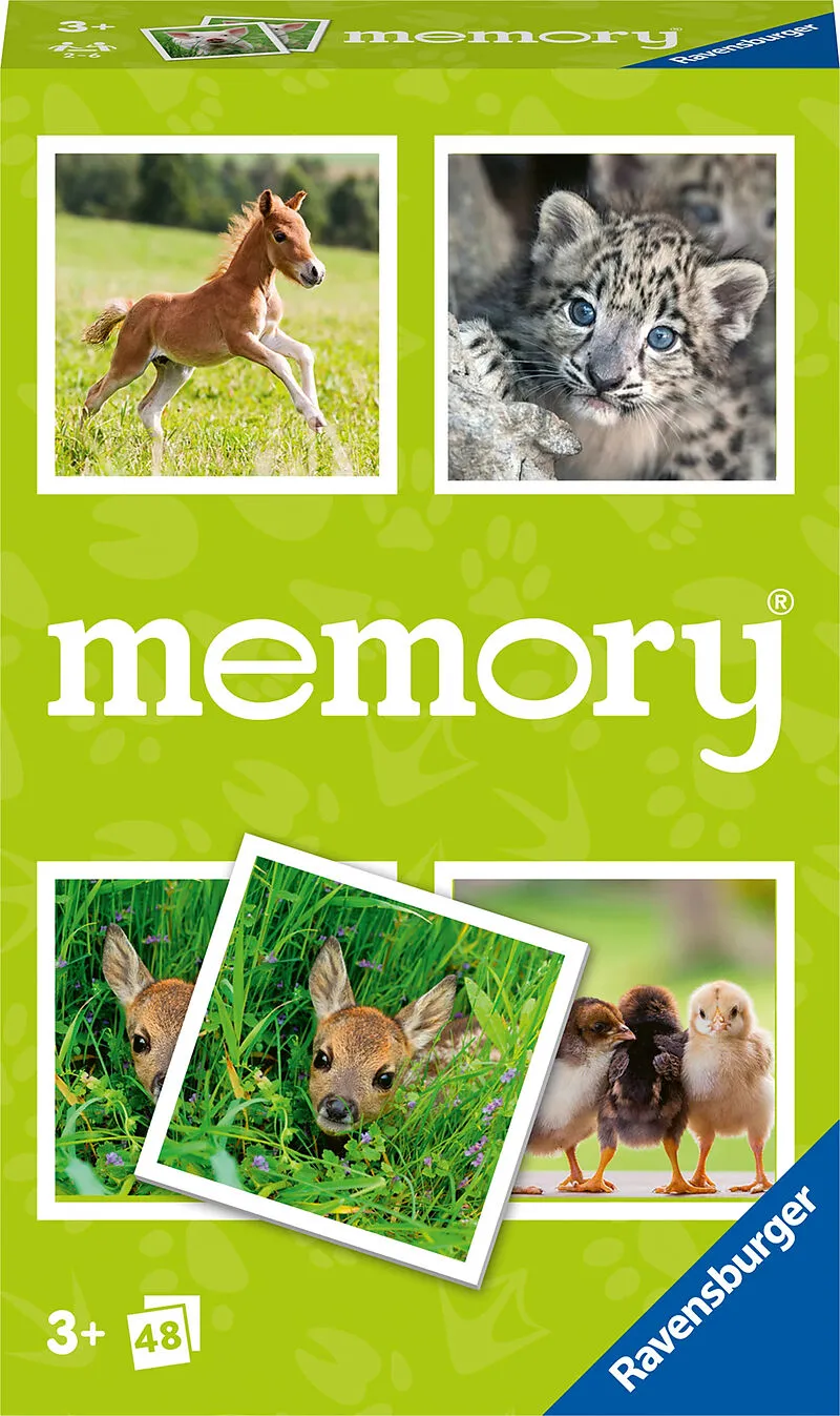 Ravensburger 22458 - Tierbaby memory®, der Spieleklassiker für Tierfans, Merkspiel für 2-6 Spieler ab 3 Jahren Rehkitz, Affenbaby, Fohlen! Kaum tauchen die goldigen Tierkinder auf, müssen sie wieder verschwinden. Bis einer mit der Zwillingskarte einen guten Fa...