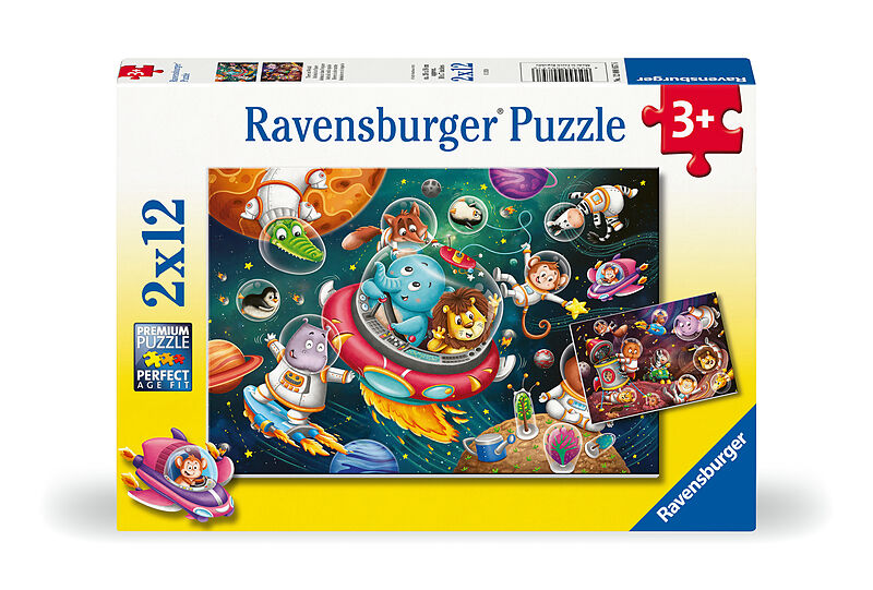 Ravensburger 12000857 Puzzle Tiere im Weltall 2 X 12 Teile Egal ob Pferd oder Kätzchen, Bagger oder Feuerwehrauto - die farbenfrohen Motive der Ravensburger Puzzlesets 2x12 Teile begeistern Mädchen und Jungen ab 3 Jahren! Gleich zwei Kinderpuzzles sorgen hier ...