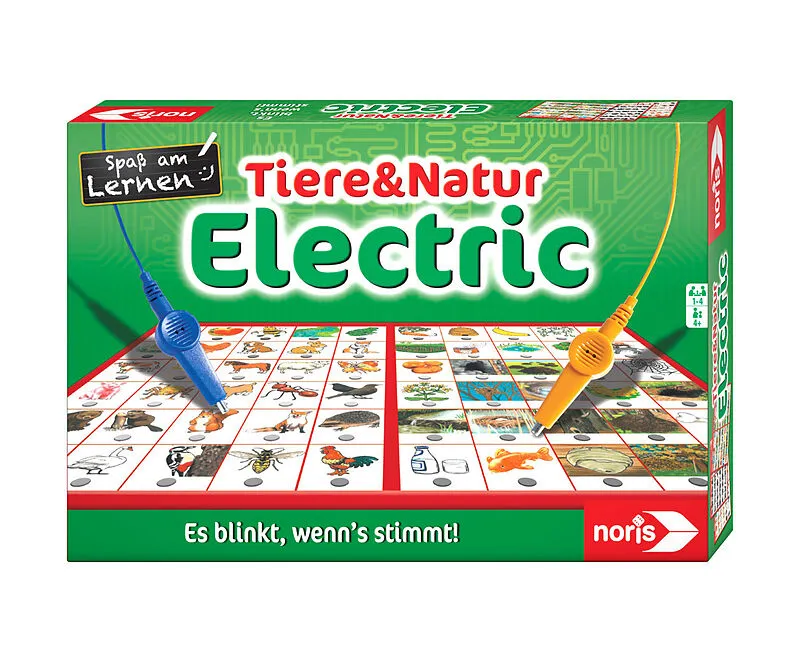Eine der 12 unterschiedlichen Tableaus mit Bildern und Themen aus dem Bereich der Tiere und der Natur wird auf das Spielbrett-Modul gelegt. Die gestanzten Löcher haben dann von unten her elektrische Kontaktflächen. Für die Spieler geht es darum, zu einem Bild ...