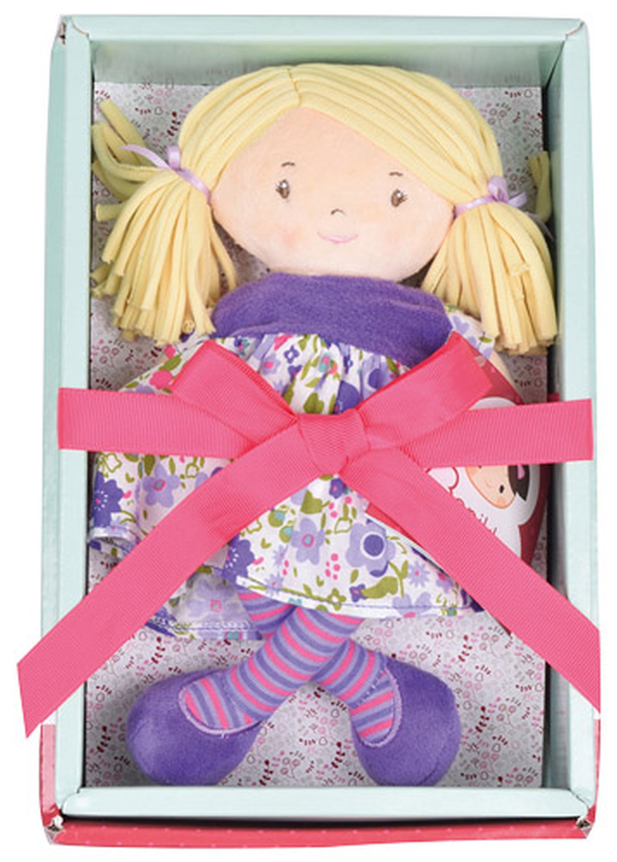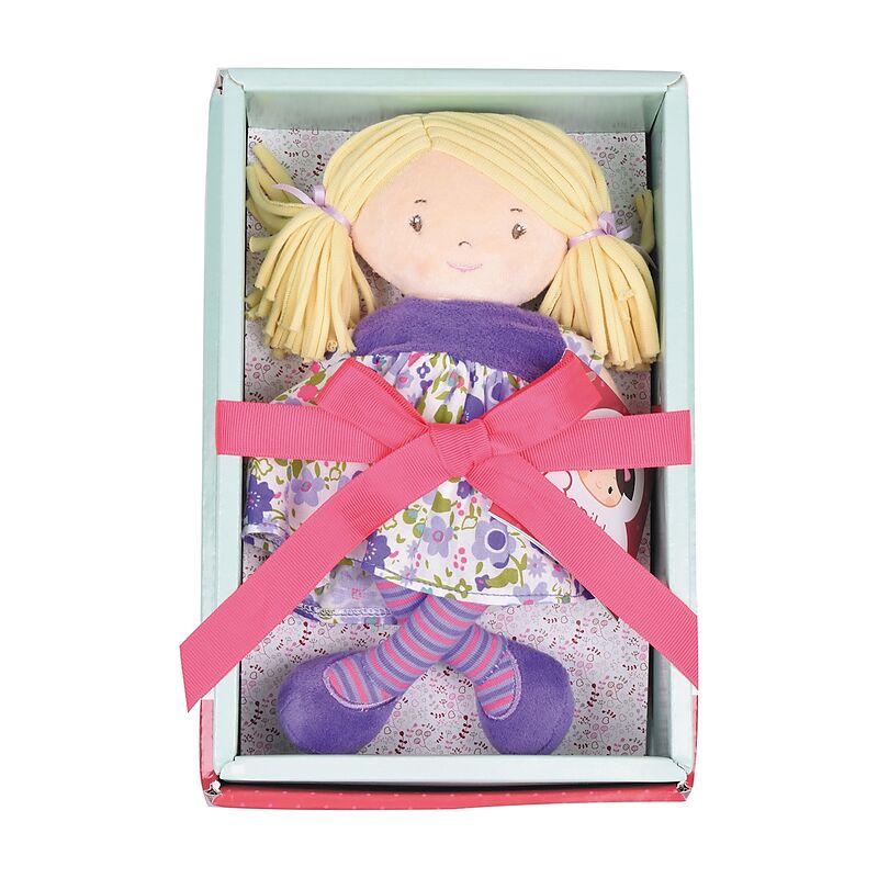 Die süße Kuschelpuppe Lil Peggy trägt ein bezauberndes zweifarbiges Kleid aus gemustertem und unifarbenem Stoff. Der Körper und das Kleid besteht aus 100% Baumwolle, die Faserfüllung aus recycelter Polyesterwatte. - Maße: 25 cm Die Puppen sind auch für Babys s...