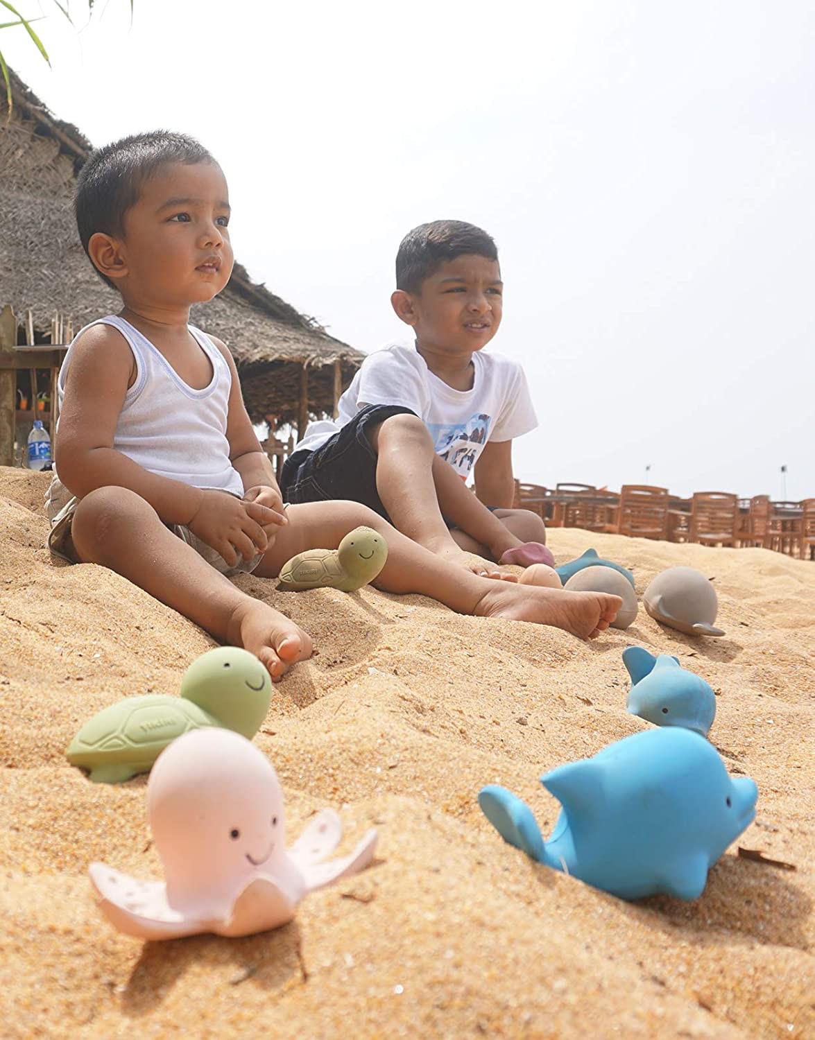 Die Babyrassel Oktopus erzeugt sanfte Geräusche, ist aus 100 % Naturkautschuk vom Heveabaum und mit Pflanzenfarben gefärbt. Dieser Beißring fördert die Motorik und ist 100% sicher für die Zahnungsphase und so konzipiert, dass er für kleine Hände leicht zu grei...