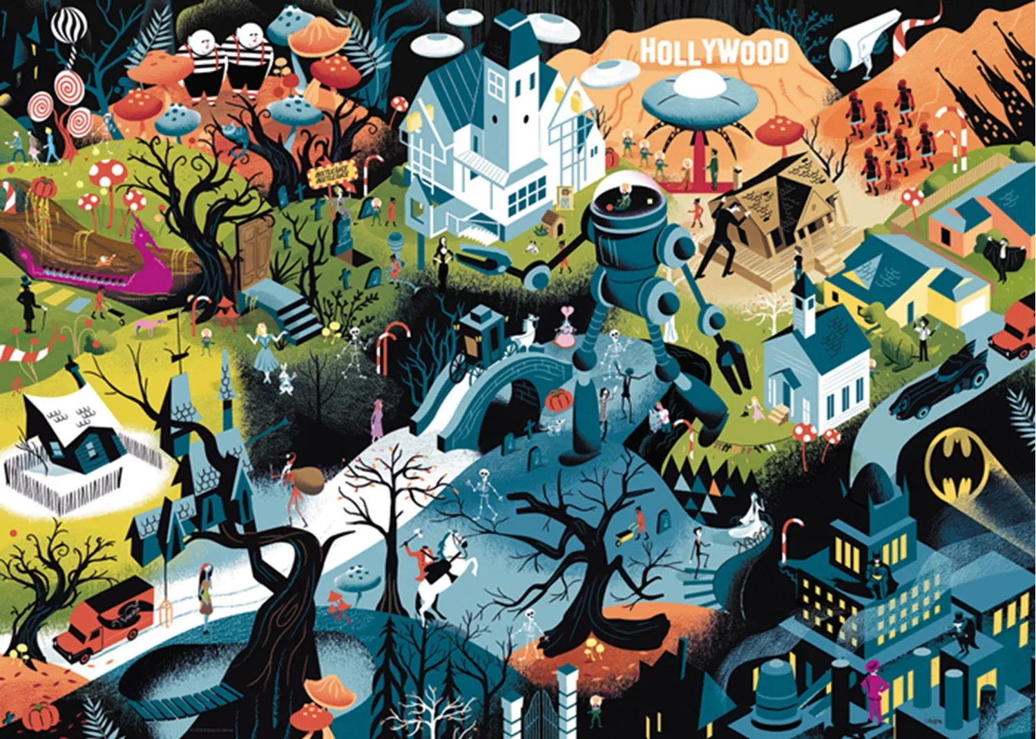 1000 Teile Aus Tim Burtons verrückten Filmfiguren hat Alexandre Clérisse ein spannendes Rate- und Such-Wimmelbild gestaltet. Dreifach-Spaß für alle Kino- und Puzzle-Fans! Gelegte Größe: 70x50 cm.