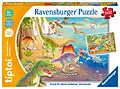 Doppelter Puzzlespaß mit tiptoi: Zwei farbenfrohe Motive zeigen die Welt der Dinosaurier. Sobald alle Puzzleteile zusammengesetzt sind, können die Kinder mit dem tiptoi-Stift die Riesenechsen entdecken. Auf jedem Puzzle sind unterschiedliche Dinos dargestellt....