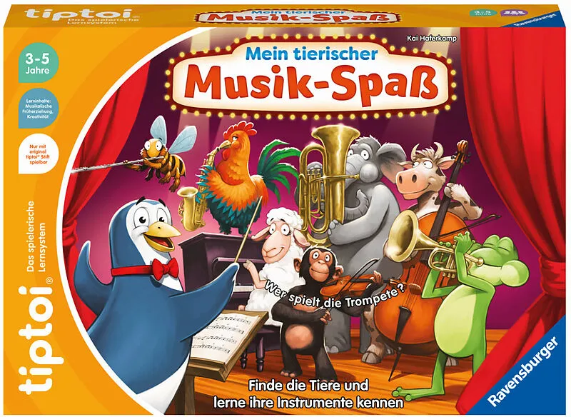 Ravensburger 169 tiptoi® Mein tierischer Musik-Spaß Wer spielt die Trompete? Der Frosch. Und wer die Harfe? Der Hund. tiptoi entführt die Kinder in eine fantastische Welt voller musikalischer Tiere. Jedes Tier spielt ein anderes Instrument. Die Kinder helfen d...