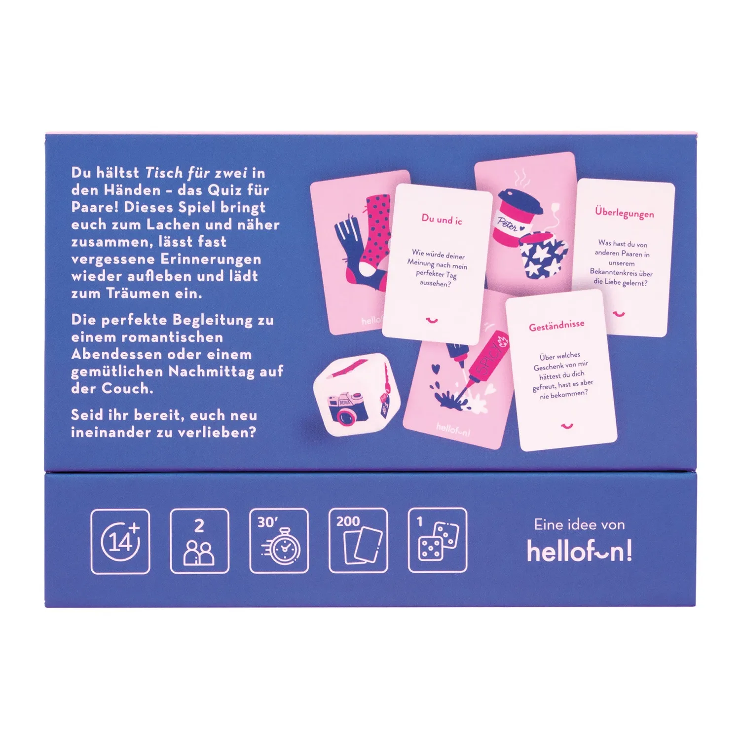 Du hältst "Tisch für zwei" in den Händen - das Quiz für Paare! Dieses Spiel bringt euch zum Lachen und näher zusammen, lässt fast vegessene Erinnerungen wieder aufleben und lädt zum Träumen ein. Die perfekte Begleitung zu einem romantischen Abendesse...