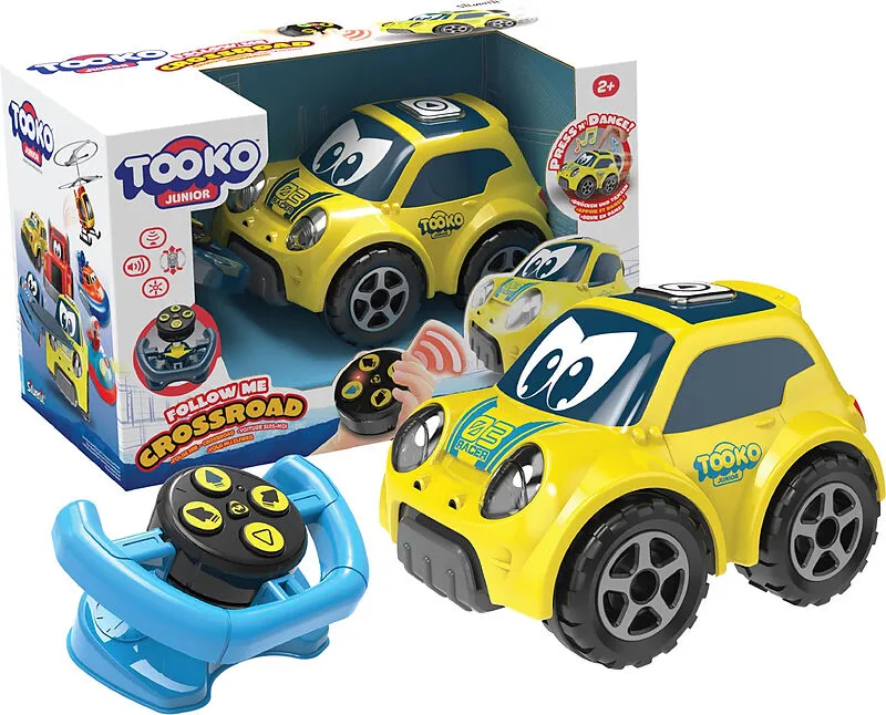 Der kleine gelbe Flitzer kann mit Hilfe der abnehmbaren IR-Fernbedienung nach links, rechts, vorwärts oder rückwärts fahren. Mit Follow me-Funktion sowie Licht- und Toneffekten. Wenn Du auf das Dach drückst, tanzt das Auto!
