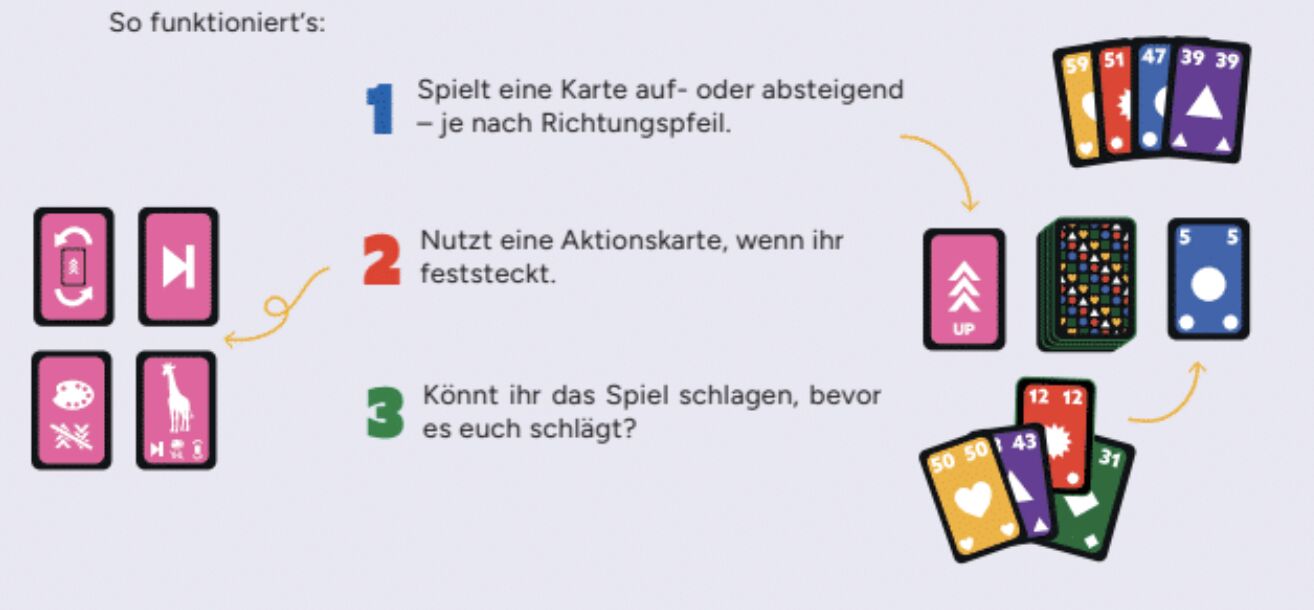 Ein kompaktes, kooperatives Spiel für Groß und Klein! Sortiert als Team eure Zahlenkarten in der richtigen Reihenfolge. Perfektes Timing ist dabei alles, denn Richtungen ändern sich und Aktionskarten können euch retten. Sortiert als Team eure Zahlenkarten auf ...