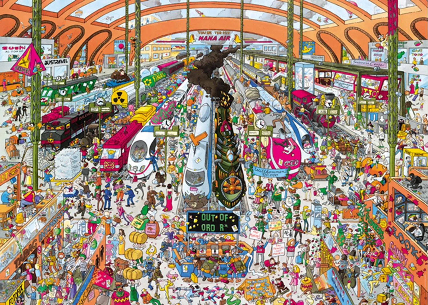 Tuuutuuut! Alle Züge(l) los! Grosser Bahnhof oben und teilweise auch unten, Christoph Schöne hat keinen Sonderzug und auch sonst nix ausgelassen, was abgeht. Gelegte Grösse: 96.6x68.8 cm.
