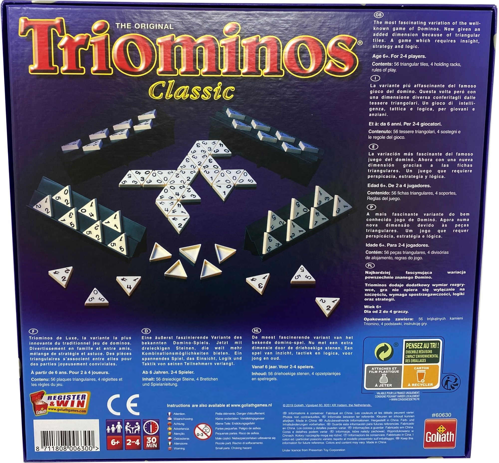 Goliath 60630 Triominos Classic GOLIATH Triominos Classic Gut hinschauen, taktisch anlegen und gewinnen! Eine fesselnde und erfolgreiche Variante des bekannten Domino Spiels mit dreieckigen Steinen und ungeahnten Kombinationsmöglichkeiten. Ein spannendes Spiel...57 Kunden haben diesen Artikel kürzlich gekauft.