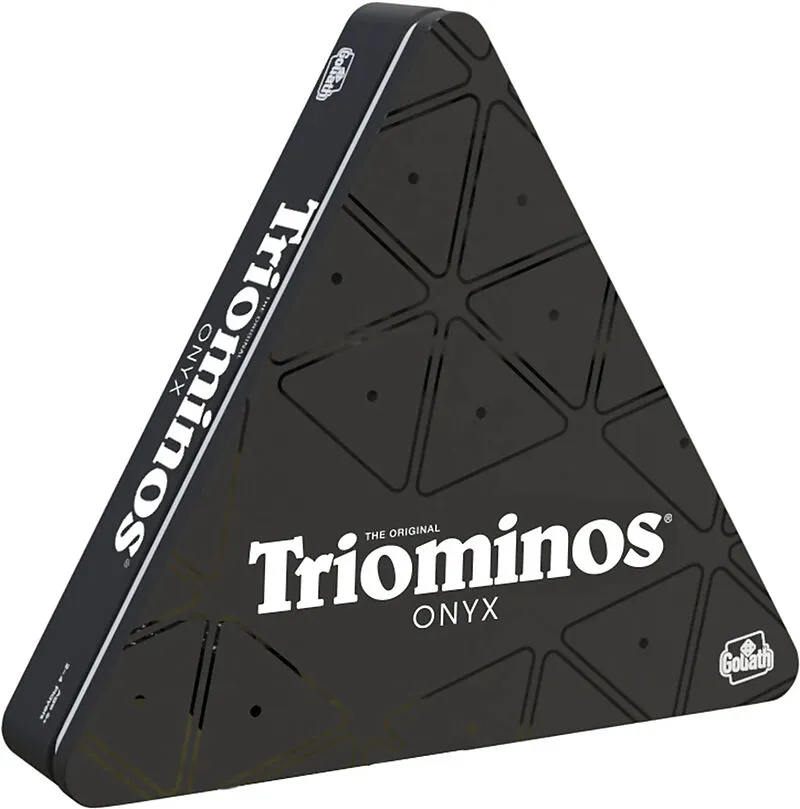Triominos Onyx Bei dieser Version von Triominos sind die Steine schwarz, hochwertig gefertigt und sorgen mit einem kleinen Metallstift in der Mitte dafür, dass sie sich einfacher aufheben lassen. In der Metallbox kann man das Spielzubehör sicher verstauen....