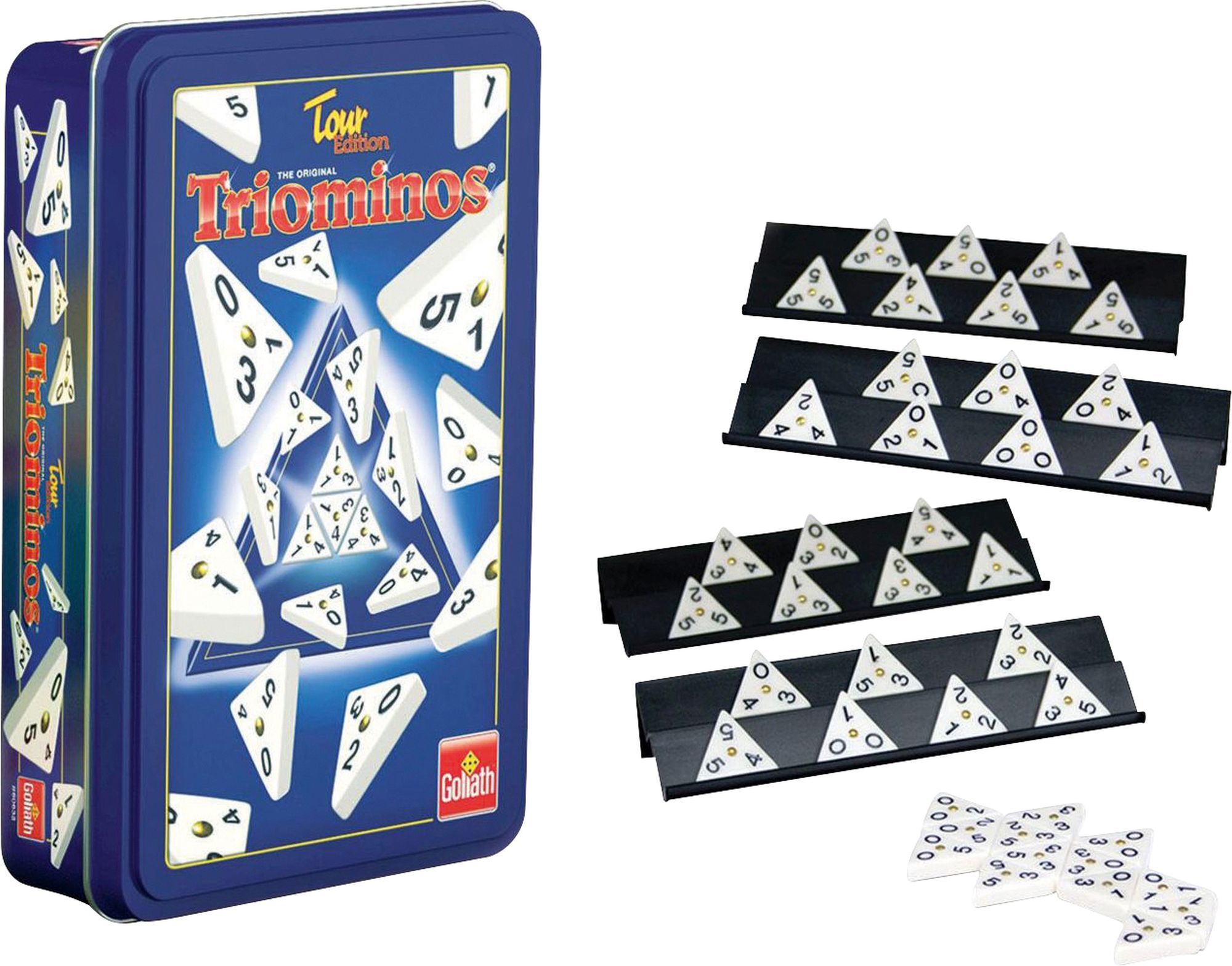 Goliath 60632 Triominos Voyager Edition Aus Triominos Tour Edition wird Triominos Voyager mit neuem Verpackungsdesign. Triominos Voyager ist der perfekte Begleiter für den Urlaub, da die Spielsteine in einer praktischen und stabilen Metalbox aufbewahrt werden ...
