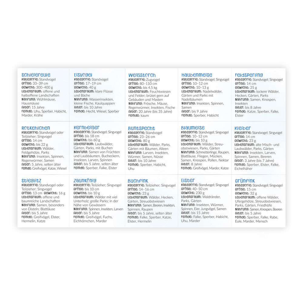 Wem gelingt es, die meisten Paare zu finden und auszulegen? Unsere heimischen Vögel sorgen mit diesem Memospiel für Spannung und Spaß! Mit kleiner Vogelkunde.