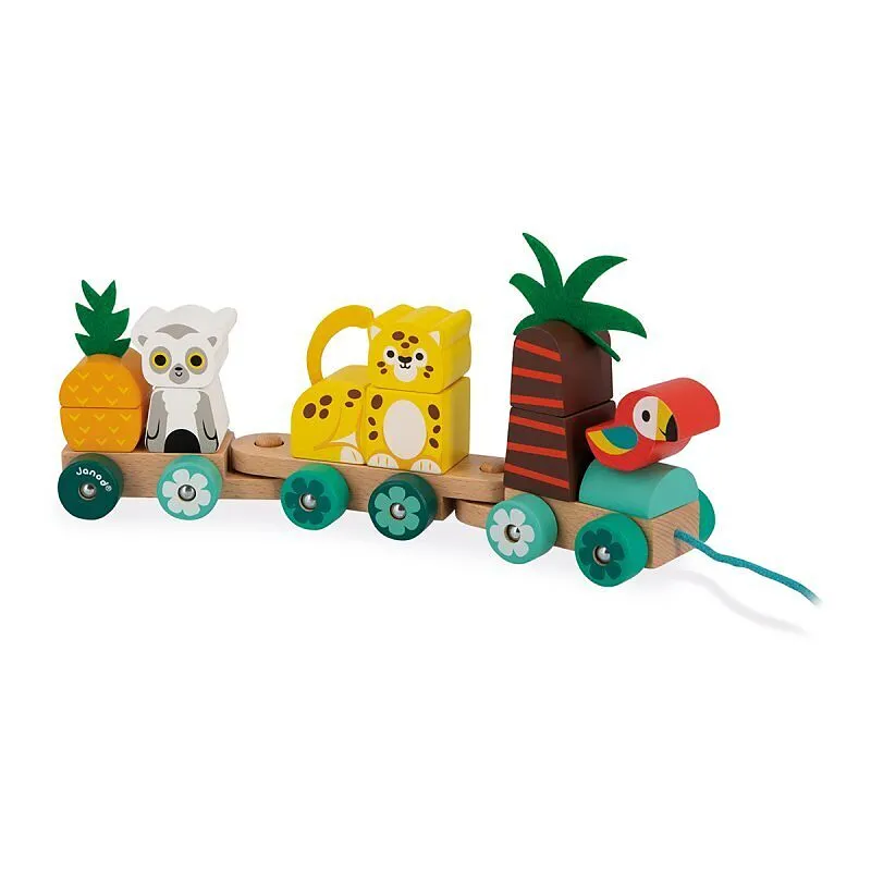 Alle an Bord für einen Ausflug durch den Regenwald! Das Spielzeug besteht aus 3 abnehmbaren Waggons und umfasst 11Teile, die Ihr Kind mit Begeisterung stapeln wird, um einen Papagei, eine Palme, einen Jaguar, einen Lemuren und eine Ananas zu bauen. Mit der Bau...