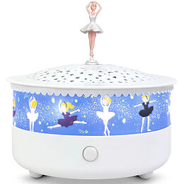 Nachtlicht mit Musik und Sternenhimmelprojektion. Nach Belieben kann die Drehung der Figur, die dezente Projektion von Sternen sowie ein manuell aufziehbares Schlaflied (Dauer 2 min 30 sek) aktiviert werden. Um die Batterie zu schonen, schaltet sich das Nachtl...