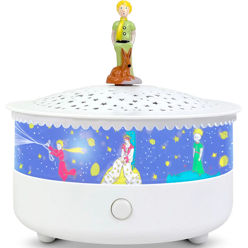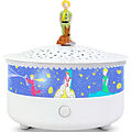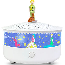 Nachtlicht mit Musik und Sternenhimmelprojektion. Nach Belieben kann die Drehung der Figur, die dezente Projektion von Sternen sowie ein manuell aufziehbares Schlaflied (Dauer 2 min 30 sek) aktiviert werden. Um die Batterie zu schonen, schaltet sich das Nachtl...