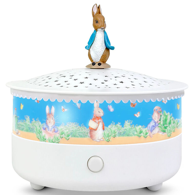 Nachtlicht mit Musik und Sternenhimmelprojektion. Nach Belieben kann die Drehung der Figur, die dezente Projektion von Sternen sowie ein manuell aufziehbares Schlaflied (Dauer 2 min 30 sek) aktiviert werden. Um die Batterie zu schonen, schaltet sich das Nachtl...