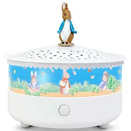 Nachtlicht mit Musik und Sternenhimmelprojektion. Nach Belieben kann die Drehung der Figur, die dezente Projektion von Sternen sowie ein manuell aufziehbares Schlaflied (Dauer 2 min 30 sek) aktiviert werden. Um die Batterie zu schonen, schaltet sich das Nachtl...