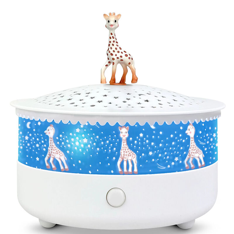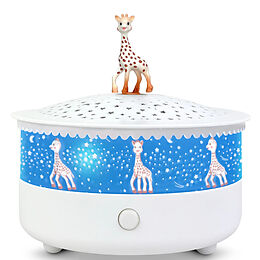 Nachtlicht mit Musik und Sternenhimmelprojektion. Nach Belieben kann die Drehung der Figur, die dezente Projektion von Sternen sowie ein manuell aufziehbares Schlaflied (Dauer 2 min 30 sek) aktiviert werden. Um die Batterie zu schonen, schaltet sich das Nachtl...
