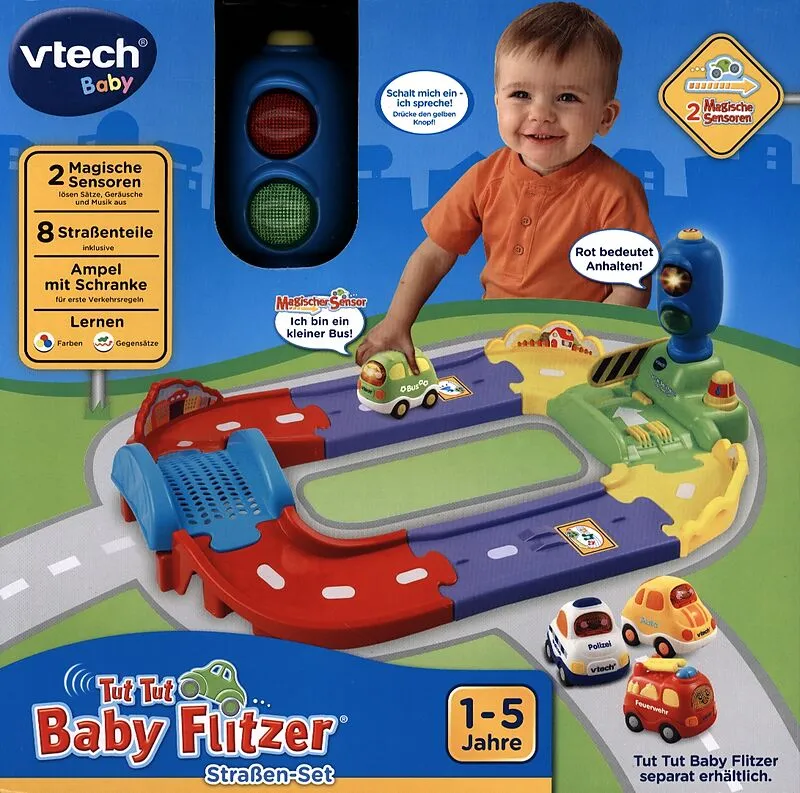 Vtech 80-127804 Tut Tut Baby Flitzer - Straßen-Set Komm, wir flitzen durch die Stadt! 8 bunte Straßenteile zum Zusammenbauen Straßenteile können auch zum Erweitern der Tut Tut Baby Flitzer Welt genutzt werden Ampel mit 2 blinkenden Lichtern Bewegliche ...