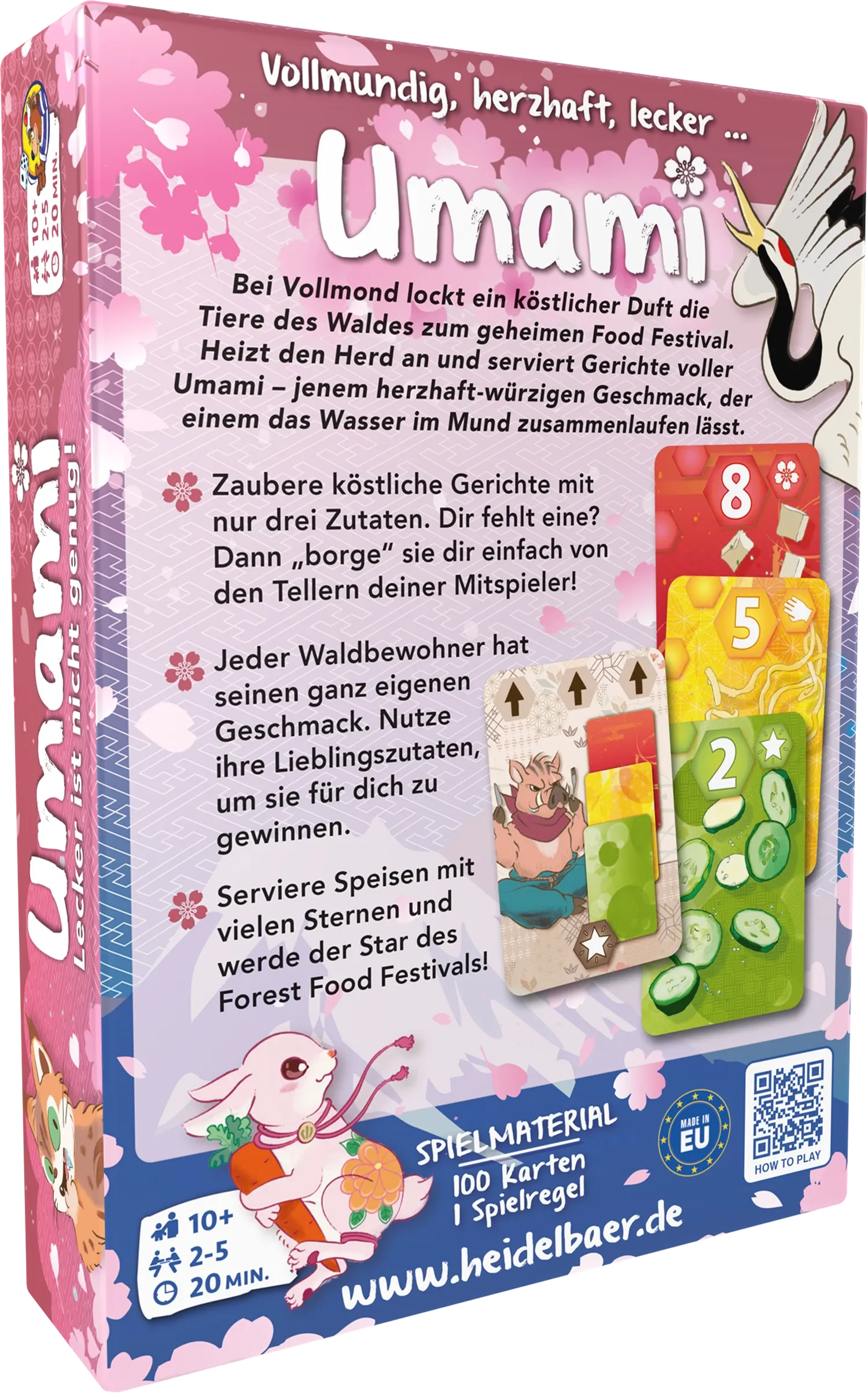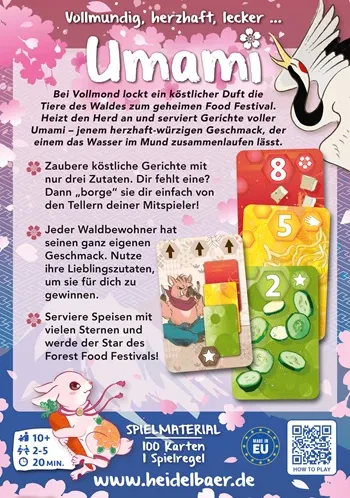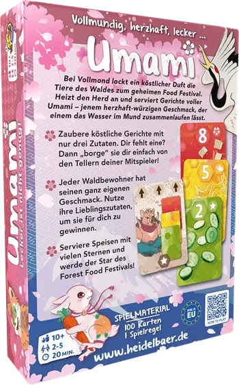 "Umami ist das geschmackvolle Kartenspiel für die ganze Familie, bei dem du mit nur drei Zutaten die köstlichsten Gerichte zauberst. Ziel ist es, die tierischen Gäste des geheimen Food Festivals für sich zu gewinnen und dafür darf auch mal bei den Mitspielern ...