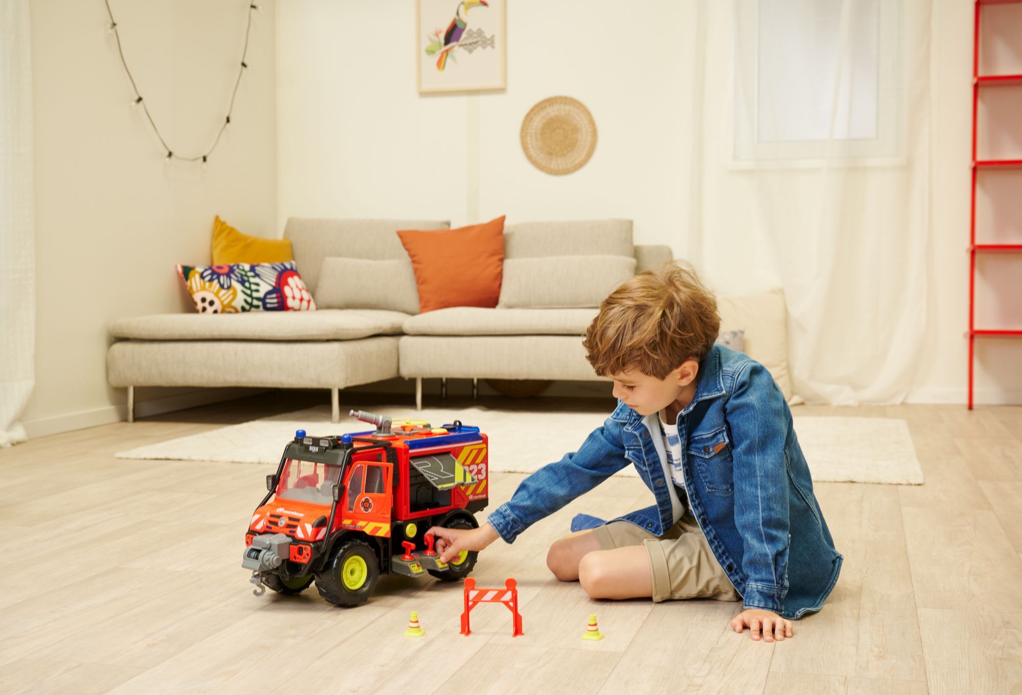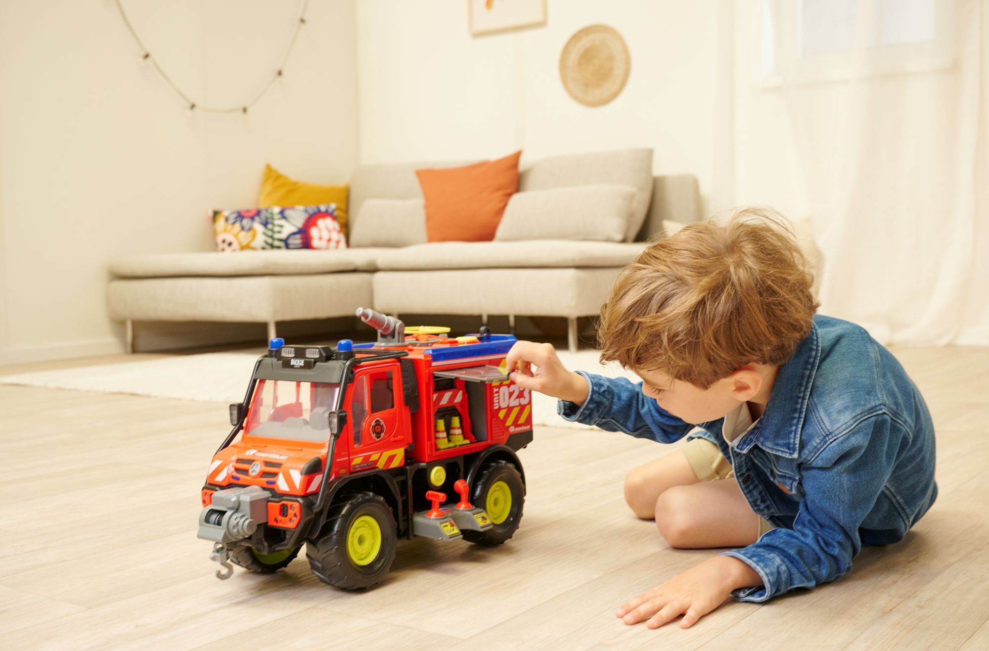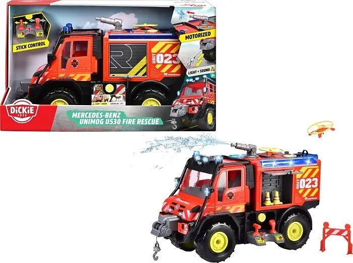 Unimog U530 Fire Rescue Freilauf,Licht,Sound,Interieur, batteriebetr.Seilwinde u. Wasser- spritze via Contr.,Türen z.Öffnen, Pendelachsen,Try Me,50cm,TB, 2 Drohnen m.batteriebetr.Abschußrampe