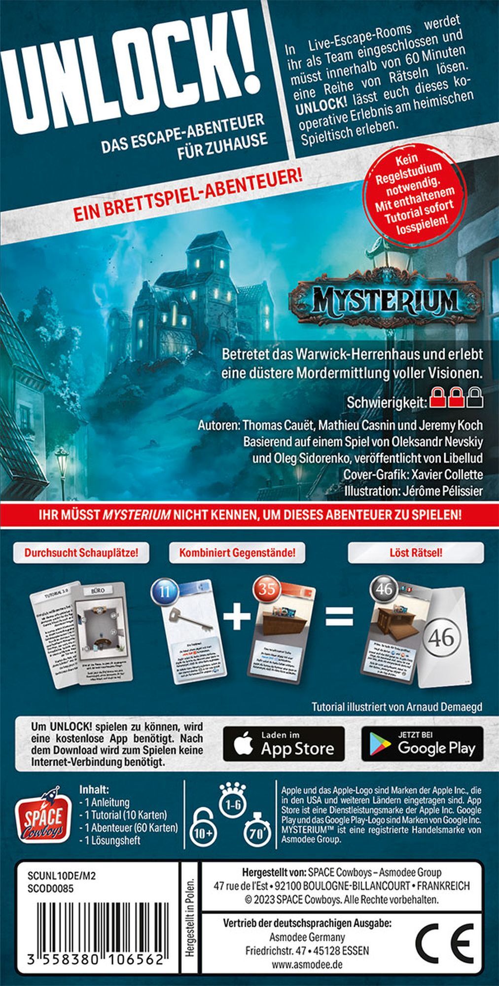 Unlock! Mysterium In Unlock! Game Adventures: Mysterium betretet ihr das Warwick- Herrenhaus aus Mysterium und erlebt eine düstere Mordermittlung voller Visionen. In Live-Escape-Rooms werden die Teilnehmer eingeschlossen und müssen es innerhalb von 60 Minuten ...