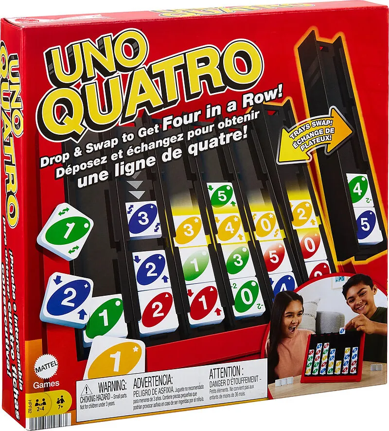 UNO Quatro Fans der UNO-Kartenspiele werden das Familienspiel UNO Quatro lieben. Die Herausforderung besteht darin, eine Viererreihe zu bilden, während man zugleich versuchen muss, eine passende Farbe oder Zahl zu finden. Wenn die Spieler an der Reihe sind, le...