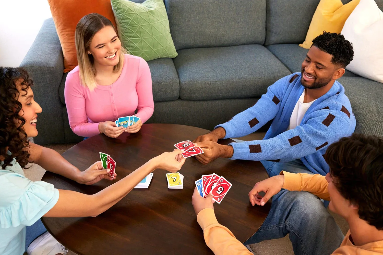 UNO Teams Kartenspiel für Kinder, Erwachsene, Familienabend, Partys und Reisen UNO Teams bietet eine neue Art, das klassische Spiel zu spielen. Spieler müssen immer noch passende Farben, Nummern und Symbole finden. Statt gegeneinander zu spielen, spielen sie i...
