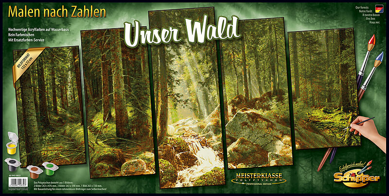 Unser Wald Meisterklasse Polyptychon Als Polyptychon bezeichnete man ursprünglich einen sog. Flügelaltar mit mehrfach geteilten Bildern. Das Motiv der "Profi-Edition" ist 5-teilig und bedeckt eine Wandfläche von ca. 132 x 72 cm. Die Anfertigung des Bildes erfo...