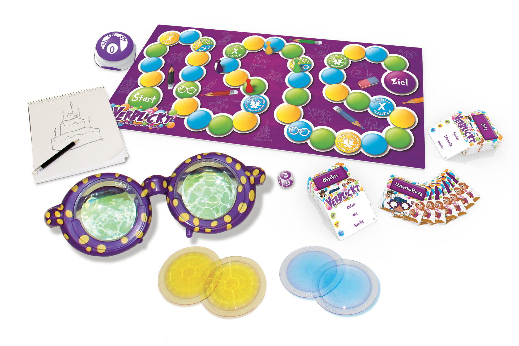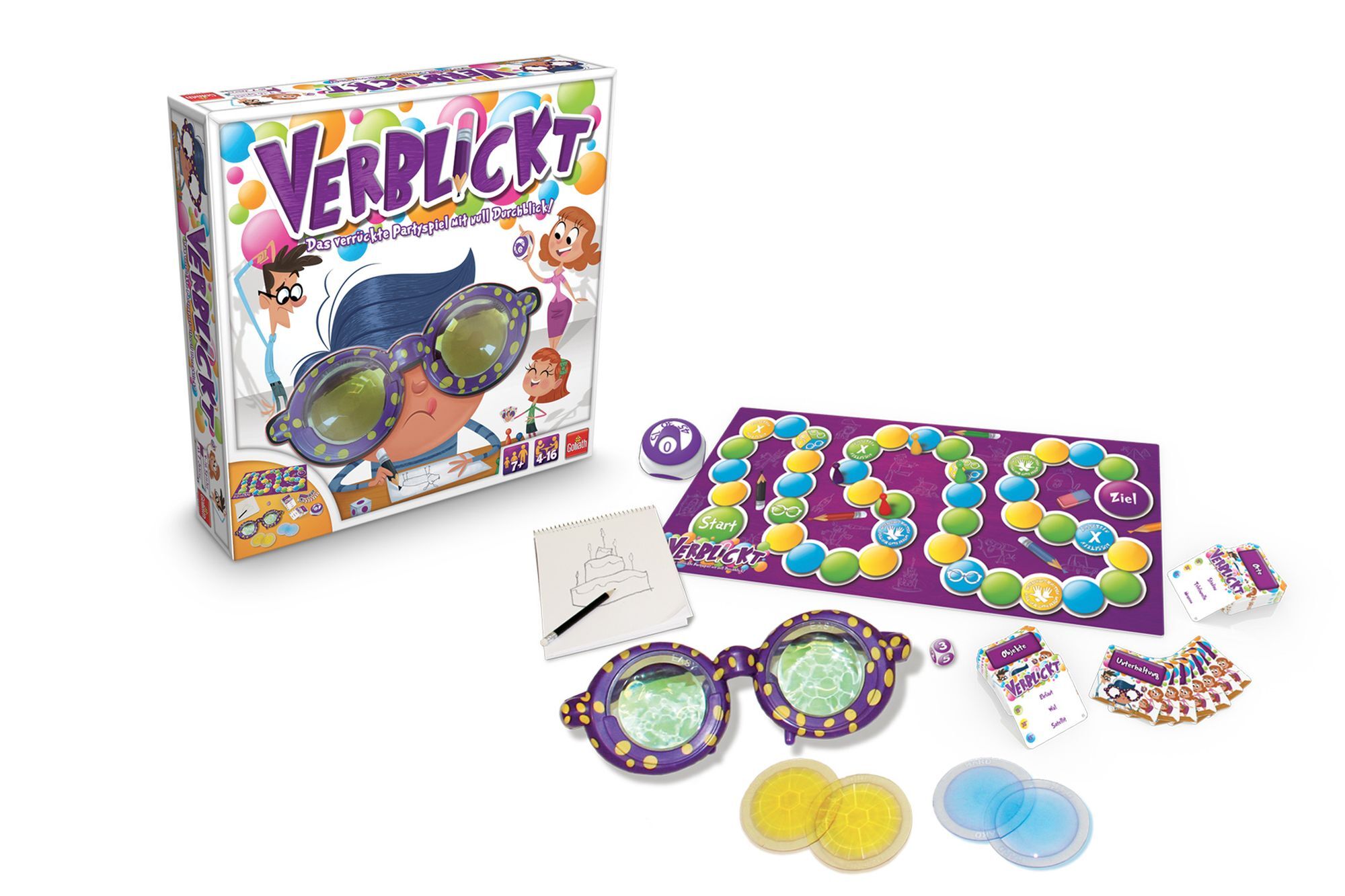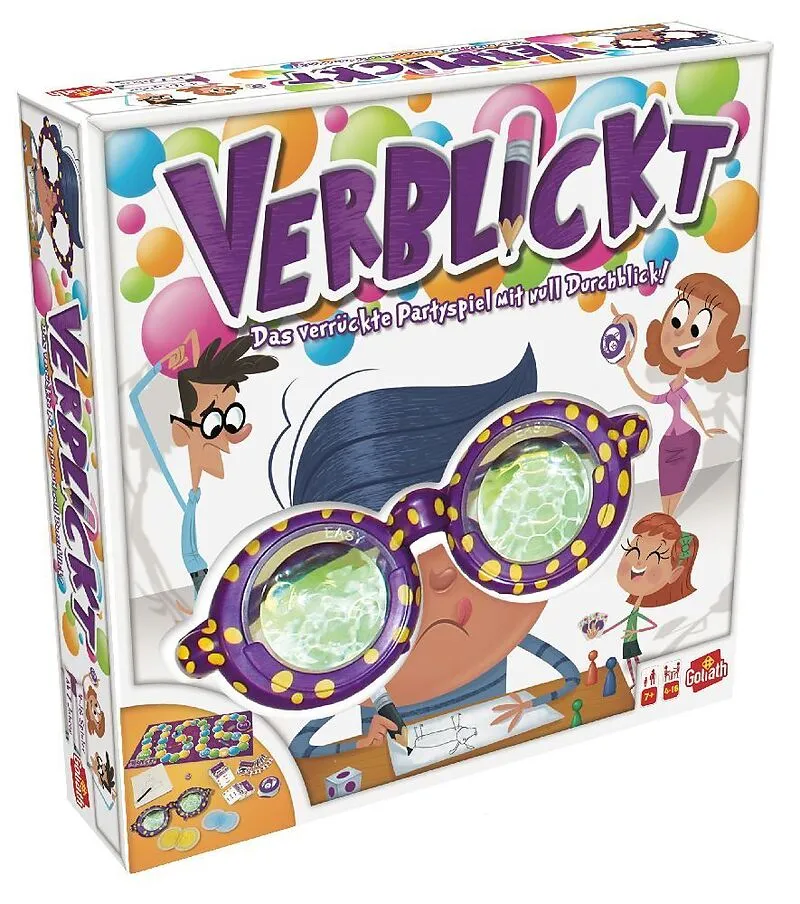 Goliath 76111 Verblickt Bei diesem Partyspiel blickt keiner richtig durch: Die Spieler tragen hier eine verrückte Brille, die den Blick total verzerrt. Nun müssen sie Begriffe zeichnen die Motive unfall- und lachfrei aufs Papier zu bringen, ist dabei fast unmö...