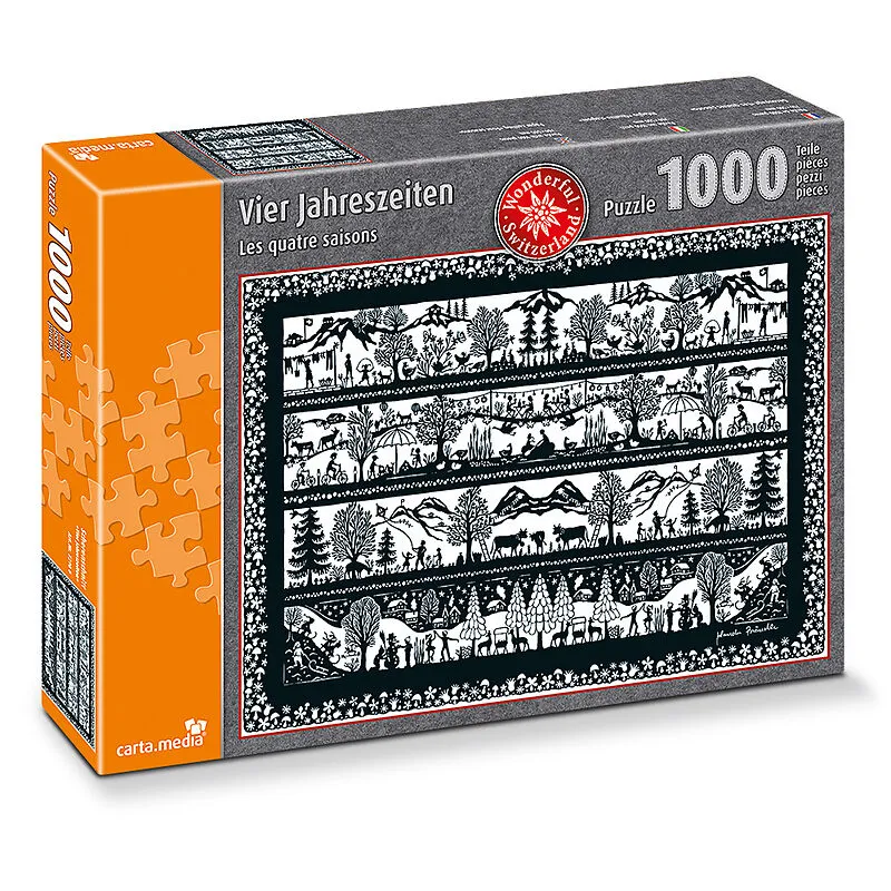 Puzzle mit 1000 Teilen im Format 70 x 50 cm. Scherenschnittmotiv von Jolanda Brändle. Motiv: Vier Jahreszeiten. Um das Jahr 1600 kam der Scherenschnitt nach einer 400 Jahre dauernden Reise von seinem Herkunftsland China uber Indonesien, Persien und den Balkan ...