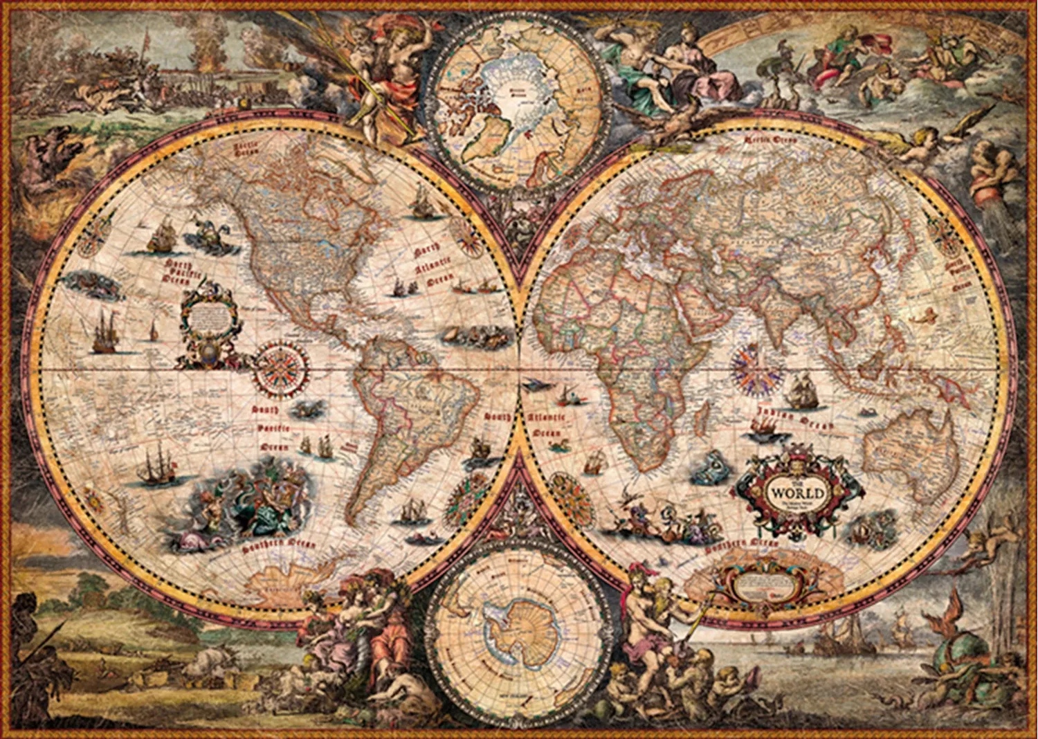 Hinter der klassischen, im antiken Stil gehaltenen Weltkartengestaltung - geteilt in Ost und West, Nord und Süd versteckt sich die aktuelle Ländereinteilung der Erde. Gelegte Grösse: 96.6x68.6 cm.
