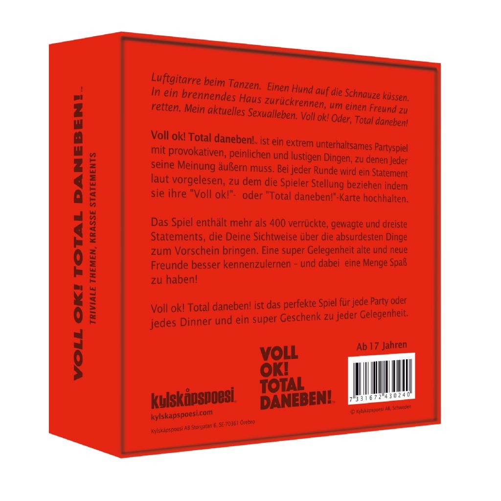 Luftgitarre beim Tanzen. Einen Hund auf die Schnauze küssen. In ein brennendes Haus zurückrennen, um einen Freund zu retten. Mein aktuelles Sexualleben. Verdammt, ja! Oder Scheiße, nein! Voll Ok! Total daneben! ist ein extrem unterhaltsames Partyspiel mit prov...