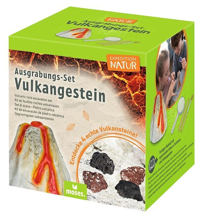 mit einem farbigen Booklet voller spannender Infos zu Vulkanen und Vulkangestein
