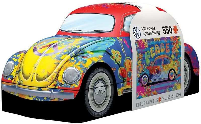 Feiern Sie den legendären VW Käfer mit dem 550-teiligen VW Beetle Splash Puzzle von Eurographics! Verpackt in einer einzigartigen Dose in Form des klassischen Autos zeigt dieses lebendige Puzzle farbenfrohe, groovige Kunstwerke, inspiriert von Frieden und Frei...