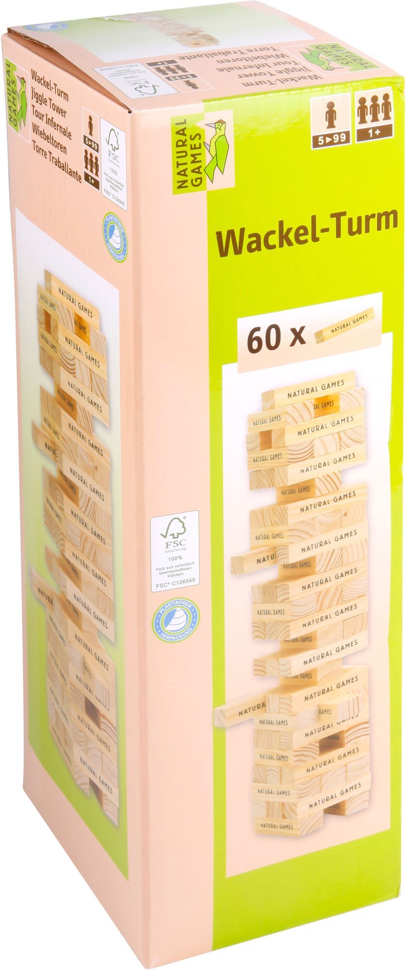 Natural Games Wackelturm mit 60 Spielsteinen. Für 1 oder mehr Spieler. In diesem Spiel stellen die Spieler ihre Geschicklichkeit und Ruhe unter Beweis. Für Kinder ab 5 Jahren.