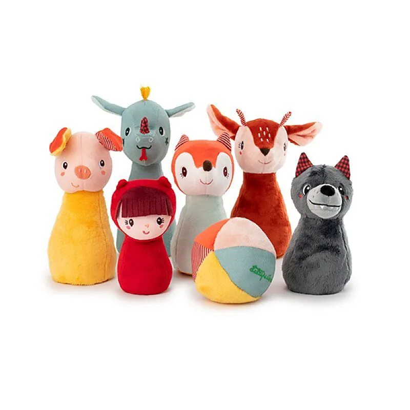 Wer kann diese fröhliche Bande von Waldfreunden mit einem Wurf umwerfen' Dieses bunte Bowling-Spiel besteht aus 6 weichen Pins und einem weichen Stoff-Rasselball. Um drinnen ohne Schäden zu spielen und ein zukünftiger Bowling-Star zu werden.