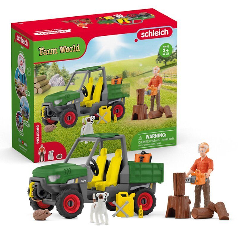 schleich® FARM WORLD 42659 Waldbauer mit Fahrzeug Bauer Paul muss im Wald Holz machen, bevor der Winter kommt. Dazu fährt er mit dem Geländewagen in den Wald zu den gefällten Bäumen. Mit der Seilwinde zieht er einen schweren Baumstamm vom Stapel. Er setzt den ...