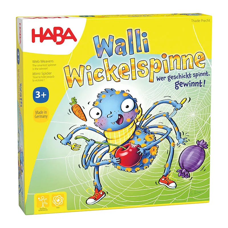 Witziges Motorikspiel von HABA: Walli Wickelspinne - robustes Spielmaterial aus stabiler Pappe und Holz - Mitbringspiel ab 3 Jahren mit Symbolwürfel und einfachen Regeln - für 2 bis 4 Fadenkünstler, Spieldauer ca. 10 Minuten - das Geschicklichkeitsspiel förder...