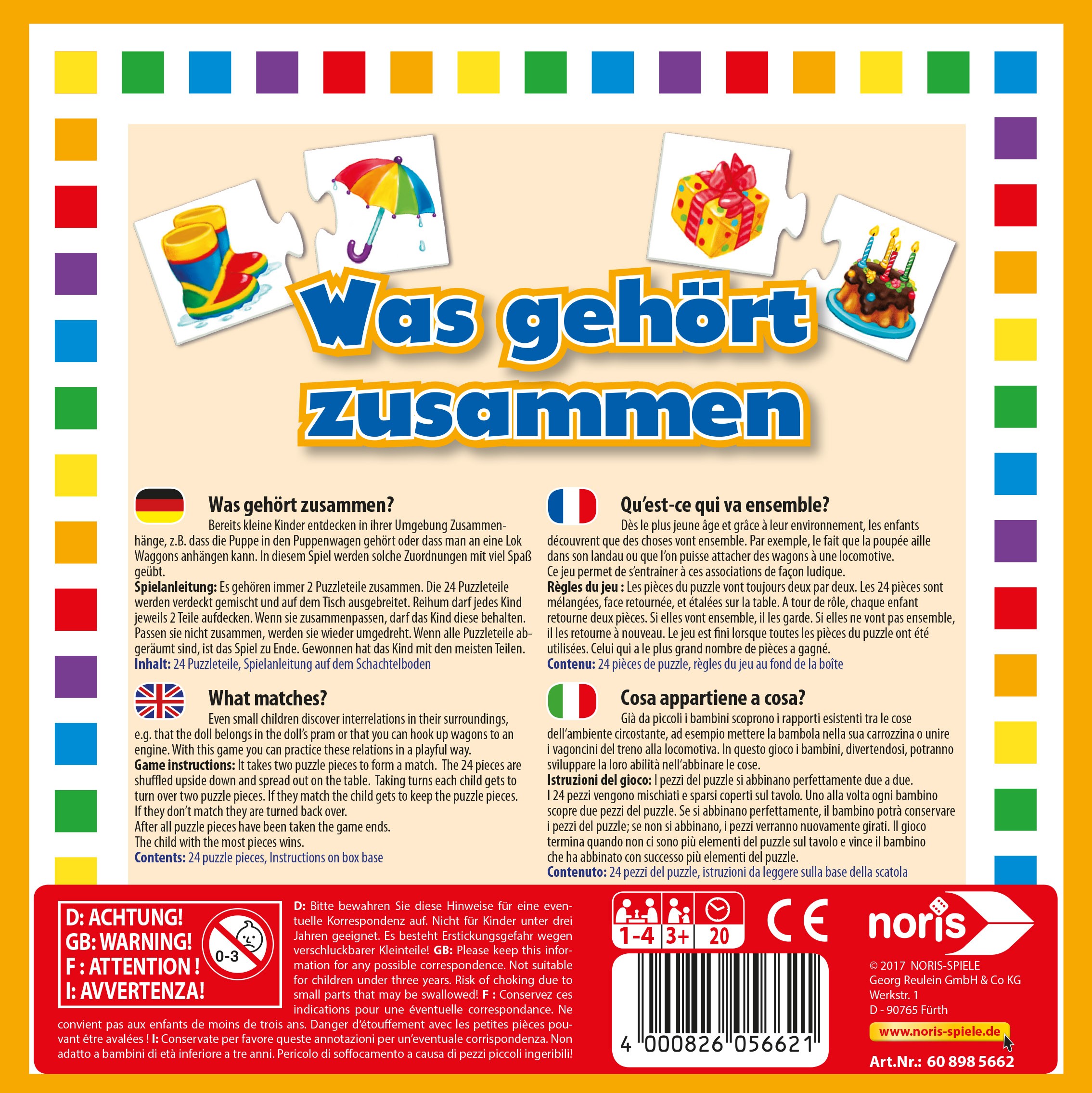 Was gehört zusammen von Noris Bereits kleine Kinder entdecken in ihrer Umgebung. Zusammenhänge, z.B. dass die Puppe in den Puppenwagen gehören oder dass man an eine Lok Waggons anhängen kann. In diesem Spiel werden solche Zuordnungen mit viel Spaß geübt. Für 1...
