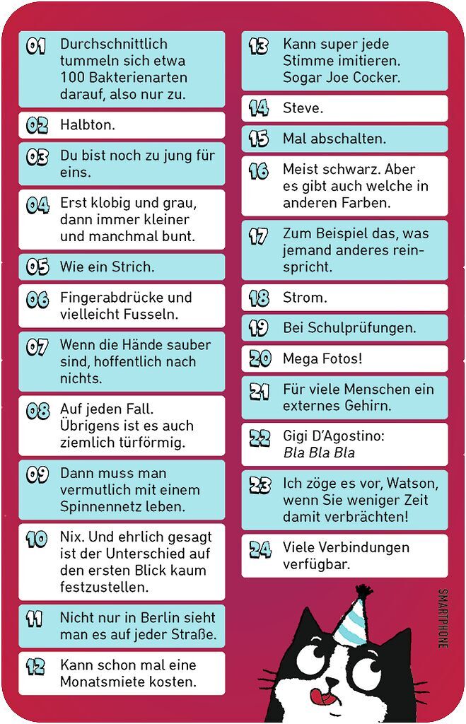 Schräger Ratespaß für verrückte Partyabende! Dieses verrückte Ratespiel sorgt für jede Menge Spaß und Überraschung! Mit absurden Fragen und skurrilen Hinweisen bringt es eure grauen Zellen zum Glühen und eure Lachmuskeln in Schwung. Wählt die richtigen Fragen ...