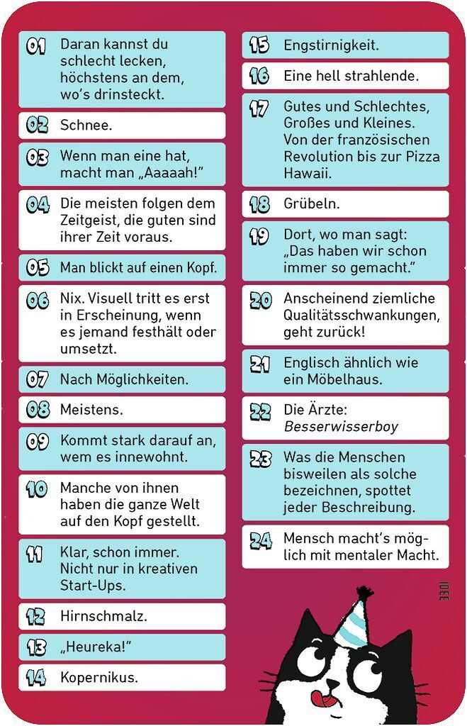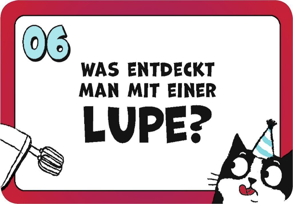 Schräger Ratespaß für verrückte Partyabende!Dieses verrückte Ratespiel sorgt für jede Menge Spaß und Überraschung! Mit absurden Fragen und skurrilen Hinweisen bringt es eure grauen Zellen zum Glühen und eure Lachmuskeln in Schwung. Wählt die richtigen Fragen u...