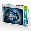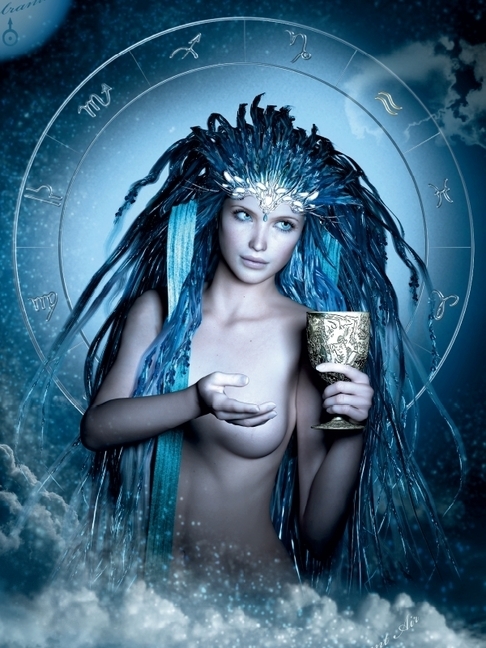 Sternzeichen Wassermann, dargestellt durch eine schöne nackte Frau, die aus den Wolken heraus dem Betrachter einen Kelch anbietet. Das Element dieses Zeichens ist die Luft, dargestellt durch Wolken und Himmel. Der Planet Uranus ist oben links zu sehen. Der Was...