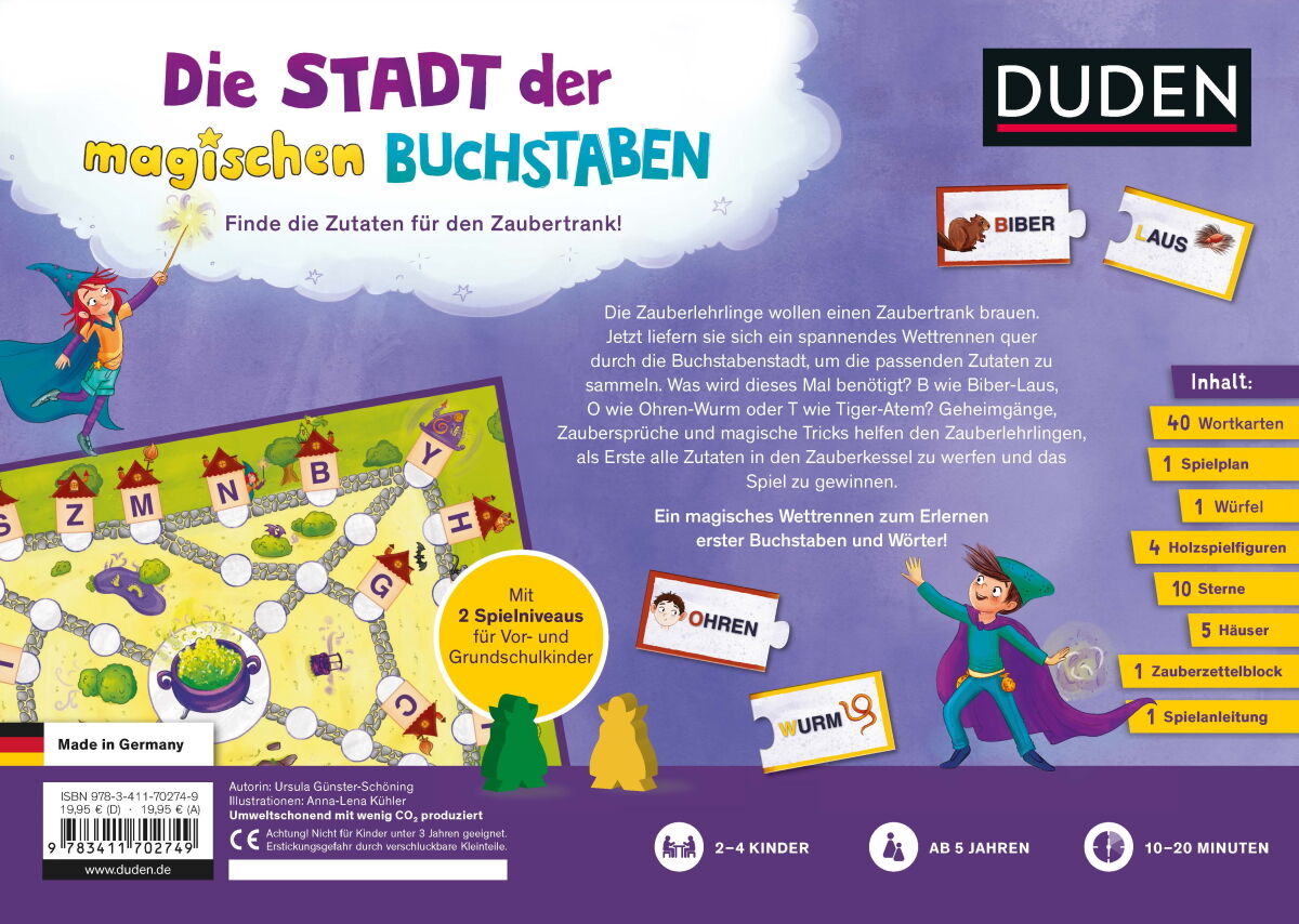 Dieses Brettspiel fördert den ersten Umgang mit den Buchstaben! Werde Zauberlehrling und sammle Zutaten für den magischen Zaubertrank! Ob Biber-Laus, Ohren-Wurm oder Tiger-Atem - sei fix und laufe von Haus zu Haus in der Buchstabenstadt, damit du als Erster de...