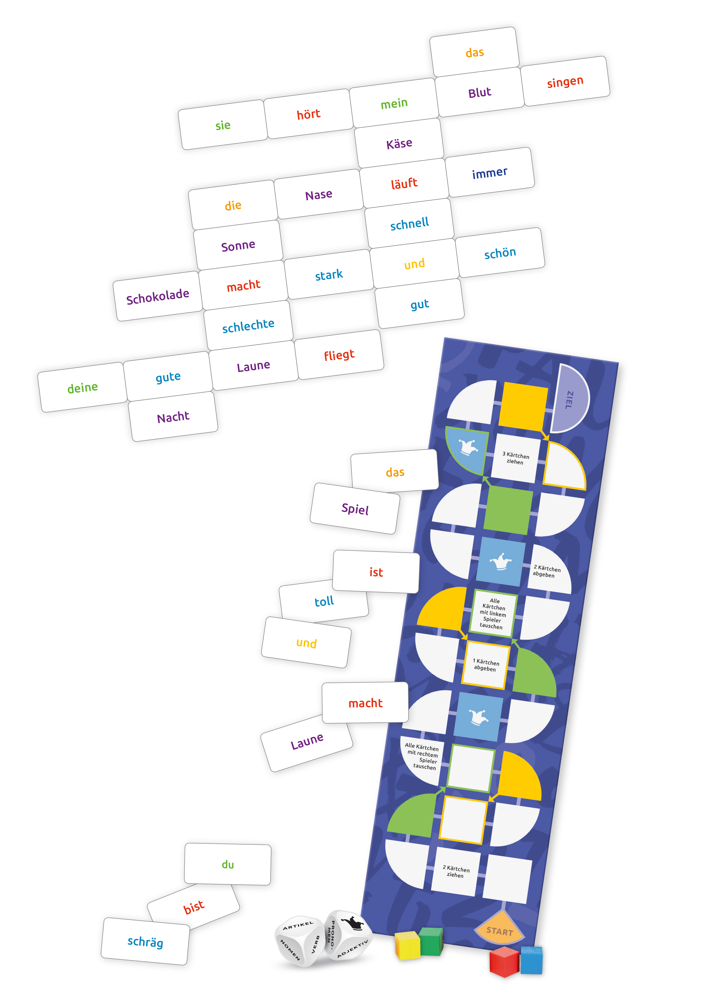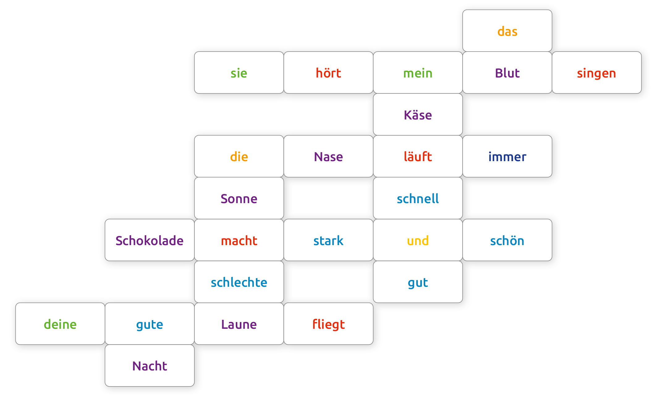 Ein Spiel für alle, die gern kreativ mit Sprache umgehen! Lege Wörter in waagerechten oder senkrechten Reihen aneinander, um Sätze zu bilden. Inhaltlich kann das völliger Unsinn sein, aber grammatikalisch muss es stimmen. Je mehr Wörter du auslegen kannst, des...