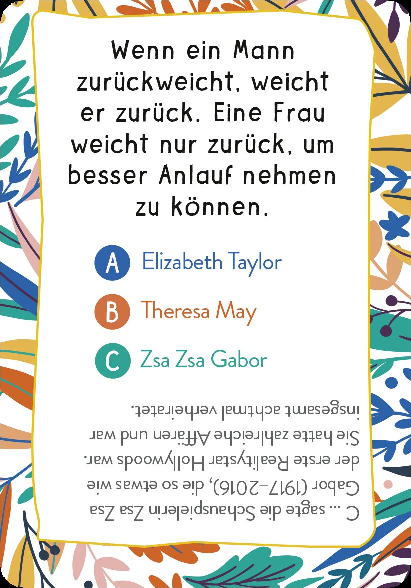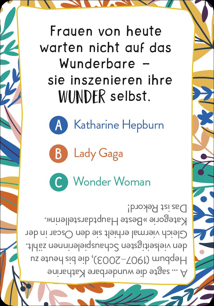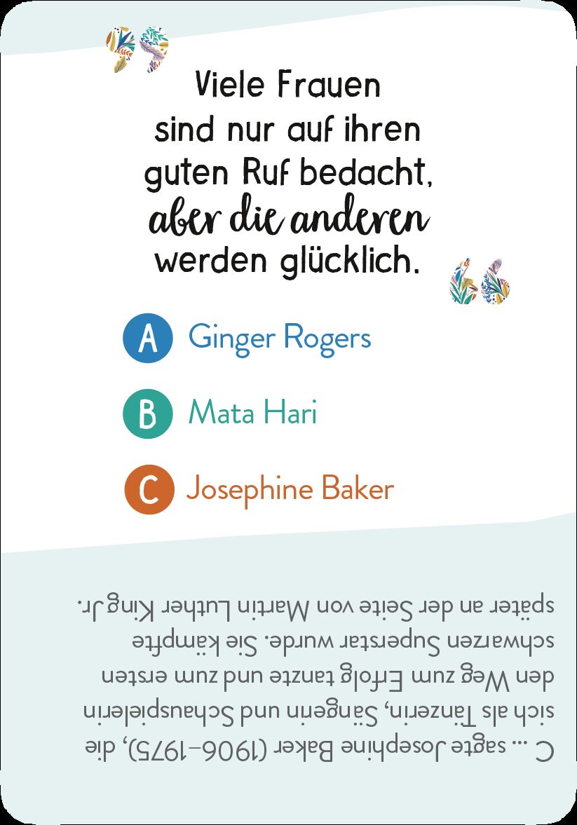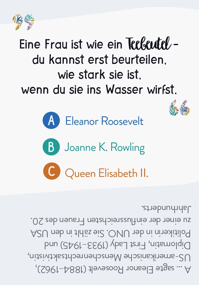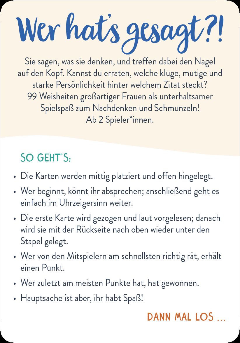 Ein spannendes Kartenspiel über starke Frauen Katharine Hepburn, Marilyn Monroe oder Eleanor Roosevelt - diese klugen, mutigen und starken Frauen nehmen kein Blatt vor den Mund, sagen was sie denken und treffen mit ihren Lebensweisheiten den Nagel auf den Kop...