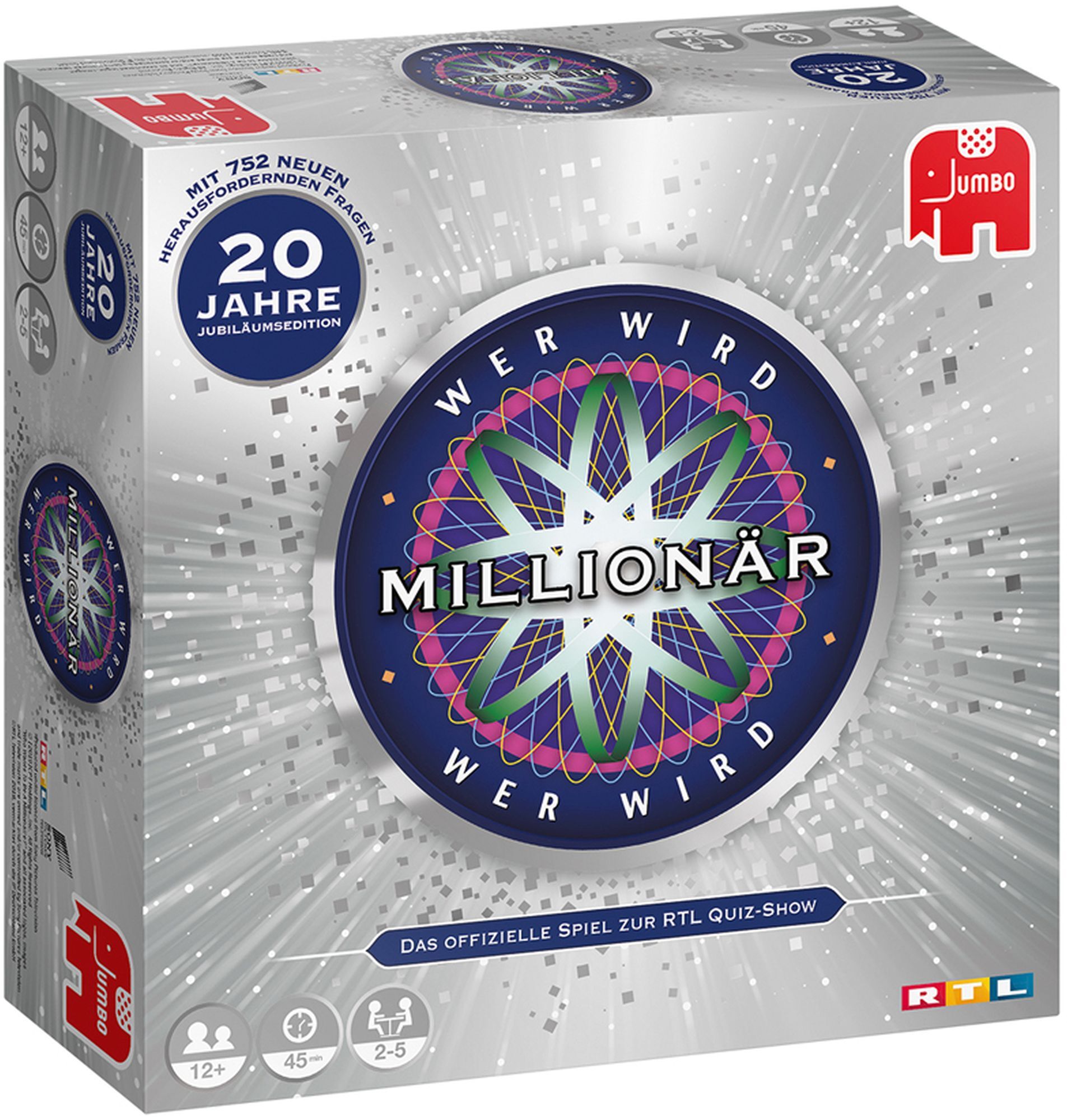 Jumbo 19736 Wer wird Millionär 20 Jahre Jubiläumsedition Mit dieser Sonderausgabe zum 20-jährigen Jubiläum holen Sie die klassische Quizshow ''Wer wird Millionär? in Ihr Wohnzimmer. Diese Edition enthält 752 neue Fragen, die eine Menge Herausforderungen und Sp...
