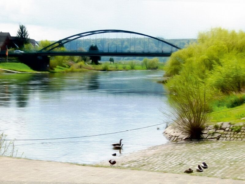 Das Weserbergland verzaubert mit seinen sanften Hügeln und Flüssen und den vielen Fachwerkhäusern in den Städten. Dieses Bild zeigt die Weserbrücke bei Beverungen mit Blick auf Lauenförde.